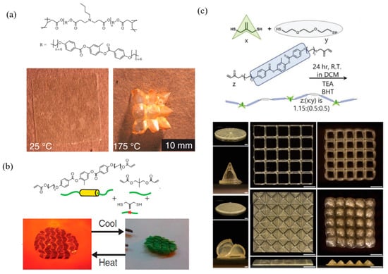 - Davidson, E.C.; Kotikian, A.; Li, S.; Aizenberg, J.; Lewis, J.A. 3D Printable and Reconfigurable Liquid Crystal Elastomers with Light-Induced Shape Memory via Dynamic Bond Exchange. Adv. Mater. 2020, 32, 1905682. [Google Scholar] [CrossRef] [PubMed]