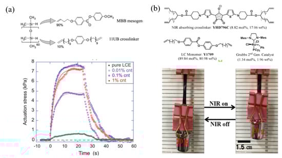 Photo responsive LCPs based on photo-heat effect. (a) An actuation stress measured by Iso-strain geometry on carbon nanotubes (CNTs)/LCPs composites irradiation with infrared light [71]. (b) The chemical structures of near-infrared spectroscopy (NIR) chromophore and LC monomers. A LCP film lifts up a load under NIR illumination irradiation. Reprinted with permission from [67]. Copyright (2017) American Chemical Society.