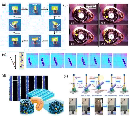 Ikeda and Yu et al. synthesized the first azo-LCP film exhibited bending behavior in response to the chosen direction by linearly polarized light (Figure 6a) [72]. The new 3D movement of azo-LCN composite materials was also reported by the same group. Based on this concept, a new photomechanical nanoscale plastic motor was developed to convert light to mechanical energy directly by simultaneous irradiation with UV and visible light at room temperature (Figure 6b) [14]. White et al. prepared azobenzene-containing monolithic LCPs (azo-LCNs) exhibiting photoinduced motion irradiation with UV–visible light. The twisted-nematic orientation transforms the films from flat to spiral ribbons, resulting in complex controllable photomechanical behaviors (Figure 6c) [75]. With the concept of the reversible change of order parameters of azobenzene units, Broer et al. designed a smart chiral nematic surface coating exhibited reversible change in the surface topology upon exposure to UV and visible light (Figure 6d) [11,80], A sponge-like coating has been developed that exhibited the ability to release and absorb a liquid after irradiation with light. The surface forces between the coating and an opposing surface can be controlled by light, resulting in tunable adhesion [81]. More recently, an interesting light-driven robot was prepared by Xia and Zhao et al. This AuNRs hybrid azobenzene LCP combined two photo responsive mechanisms of the trans–cis photoisomerization of azobenzene exposure to UV and LC–isotropic phase transition by AuNR’s NIR photo-heat effect, showing preciously controllable motions (Figure 6e) [45].