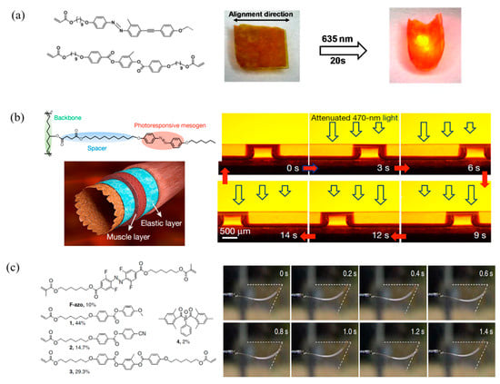 - Pang, X.; Lv, J.-a.; Zhu, C.; Qin, L.; Yu, Y. Photodeformable Azobenzene-Containing Liquid Crystal Polymers and Soft Actuators. Adv. Mater. 2019, 31, 1904224. [Google Scholar] [CrossRef] [PubMed]
