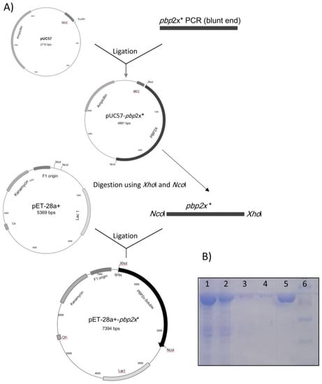 For the purification of the soluble PBP2x (PBP2x*), a PCR of the pbp2x gene (2171 bp) was generated with NcoI and XhoI overhangs, including a deletion in the sequence coding for residues (19–48) located near the N-terminal end of the protein that is responsible for membrane binding [23]. The blunt-end cloning of the PCR fragment into an EcoRV digested pUC57 resulted in pUC57-pbp2x*. The plasmid was used for the sequence verification of the insert and sub-cloning of the insert into the NcoI and XhoI cloning sites of the pET28a+ expression vector, creating pET28a+-pbp2x* (Figure 1).