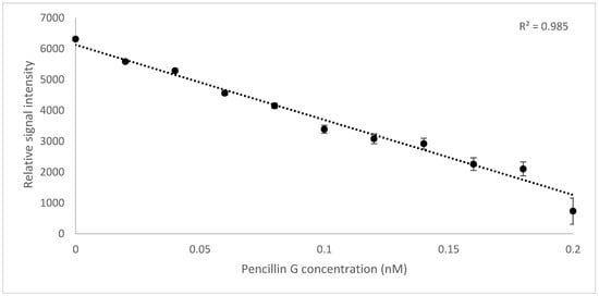 The results showed a linear correlation (R2 = 0.9825) between the increasing concentration of penicillin G in the reaction mixture (0–0.2 nM) and the amount of the bounded Bocillin FL to the protein, being calculated indirectly by subtracting the fluorescent intensity of the Ni-column wash flow from the entire fluorescence intensity of Bocillin FL (0.2 nM) used in the reaction (Figure 3).