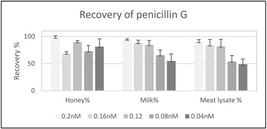 A recovery test of the antibiotic in three different samples (honey, milk, and meat-lysate) was performed by adding penicillin G (at concentrations of 0.04, 0.08, 0.16, and 0.2 nM). The later concentration of the antibiotic was quantified while using the on column biosensor method. The highest recovery (97%) was seen in the samples containing 0.2 nM of the antibiotic, followed by the milk sample with the same concentration of the antibiotic. The recovery percentage was lowered by lowering the antibiotic concentration in all three samples. The lowest recovery percentage was found inside the meat-lysate (Figure 4).