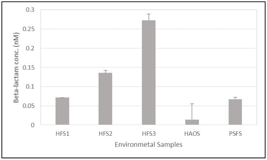 In this work, different smear samples from hospital floors were explored for penicillin G traces using the established biosensor assay with the aid of a real-time PCR machine to read the fluorescence signal and, interestingly, all of the samples were positive for the antibiotic detection. The maximum antibiotic contamination was detected in a sample taken from the floor of a patient treatment room, followed by a sample taken from an intensive care unit (0.27 nM, and 0.13 nM, respectively), and the lowest contamination was found in a sample taken from floor of an administration room of the hospital (0.014 nM) (Figure 5). It has been confirmed that most antibiotics are not completely metabolized in the human body, and studies confirmed the excretion of about 25–75% of given antibiotics to the environment in an inactive form through coughing, vomiting, urine, and feces; thus, antibiotics that are used by a humans can be found at various concentrations in hospital effluents [34,35]. In addition, the use of processed and untreated wastewater as fertilizer might contribute to a significant contamination and development of antibiotic-resistant bacteria [36,37]. Although some antibiotics in nature can degrade very fast, some of them can persist for a long time [36]; however, the principal of degradation mechanism of each antibiotic basically relies on its chemical structure [38]. Contrary to expectations, low contamination was noted in the samples that were taken from a pharmacy store in comparison to the other areas of the clinic, except for the administration room. This can be explained by extra care from the pharmacist during the antibiotic distribution and preventing damage to the packaging material of the antibiotics. Besides, professional and deep cleaning of the area by the hospital service staff has a significant impact on this type of contamination.