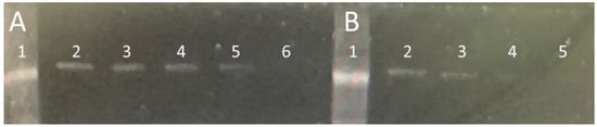 SDS gage for optimization of binding of Bocillin FL and PBP2x* imaged ChemiDoc-It®2 Imager. (A) Lane 1: protein marker 70 kDa band (PageRuler Pre-stained NIR Protein Ladder (Thermo Fisher Scientific (Waltham, MA, USA)), lanes 2-6: Binding reaction of 1 µM of Bocillin FL with 1, 0.5, 0.25, and 0.1 µM of soluble PBP2x*, respectively. (B) Lane 1: Protein marker, lanes 2-5: Binding reaction of 1 µM of soluble PBP2x* with 0.5, 0.25, 0.1, and 0.05 µM of Bocillin FL, respectively.