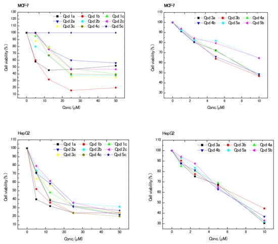 The newly synthesized derivatives were evaluated for their anticancer potential towards breast (MCF-7) and hepatocellular (HepG2) cancer cell lines cell lines. Compounds 6a–c did not show any cytotoxic activity against both tested cell lines. Generally, all other derivatives, with the exception of compound 5c, showed concentration-dependent effects on both cell lines (Figure 2). Moreover, potential positive anticancer compounds showed varying effects ranging from potent to moderate effects. Increasing the applied concentration gradually increased the cytotoxic effects and correspondingly decreased cell viability. On the other hand, compound 5c did not show any activity against MCF-7 cells, and was only active against HepG2 cells. Additionally, compounds 2a and 5a–c were considered practically inactive against MCF-7 cells, since they exhibited higher compound concentrations required to inhibit cell viability by 50% (IC50; > 100 μM) at the investigated concentration ranges. Furthermore, all compounds which exhibited anticancer activities were found to be more effective (lower IC50 values, Table 1) on HepG2 cells than MCF-7 cells. This can be attributed to the fact that different biological systems react differently toward same affecting compounds due to inherent morphological and membrane-structural differences among different cell lines [30,31,32]. For HepG2 cells, compounds 1a,b, 3a,b, 4a–c, and 5a–c were more potent than compounds 1c, 2a–c, and 3c, which were the least effective against HepG2 cells. According to the IC50 values, the order of activity of the most potent compounds can be arranged as 1a > 5b > 5a > 4b > 4a > 3a > 1b > 5c > 4c > 3b (IC50: 6.62 ± 0.35, 7.09 ± 0.78, 7.12 ± 0.79, 7.17 ± 0.89, 7.31 ± 0.59, 8.06 ± 0.86, 8.73 ± 0.47, 9.57 ± 0.1.14, 9.63 ± 0.93, and 9.66 ± 0.79 µM, respectively). On the other hand, the least effective compounds showed a decreasing order of 3c > 1c > 2a > 2b > 2c (IC50: 16.96 ± 1.16, 17.01 ± 0.97, 17.51 ± 0.87, 18.68 ± 0.99, and 19.32 ± 1.06 µM, respectively). On the other hand, for MCF-7 cells, compounds 1b, 3a,b, and 4a,b were the most potent derivatives, where their decreasing order can be arranged as 4b > 4a > 3b > 3a > 1b (IC50: 9.19 ± 0.55, 9.30 ± 0.54, 9.91 ± 0.49, 10.32 ± 0.55, and 10.90 ± 0.53 µM, respectively). Furthermore, compound 1b showed moderate activity with an IC50 value of 15.33 ± 0.67 µM. Moreover, the order of the least effective compounds can be arranged as 4c > 2b > 3c > 2c > 1c (IC50: 19.55 ± 1.03, 20.70 ± 0.97, 22.86 ± 0.99, 24.94 ± 1.08, and 34.89 ± 1.27 µM, respectively). On the other hand, compounds 2a and 5a–c were ineffective against MCF-7 cells in terms of IC50 values. The IC50 values obtained for positive controls (tamoxifen and cisplatin) were 29.34 ± 1.15 and 10.93 ± 0.96 µM for HepG2 cells, respectively, and 22.37 ± 2.41 and 8.89 ± 0.37 µM, for MCF-7 cells, respectively.
