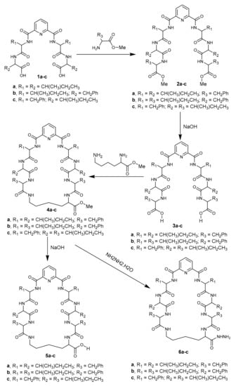 3.1.4. Synthesis of cyclo-(Nα-dipicolinoyl)-bis[tripeptide]-L-Lys-carboxylic acid (5a–c)