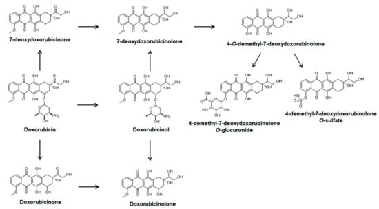 - Derek, W.E.; Rashmi, N.; Simon, C.; Kyle, M.B.; Jonathan, P.J.M.; Amadeo, M.P. Role of drug metabolism in the cytotoxicity and clinical efficacy of anthracyclines. Curr. Drug Metab. 2015, 16, 412–426. [Google Scholar]