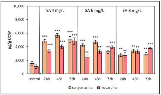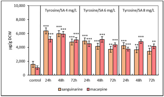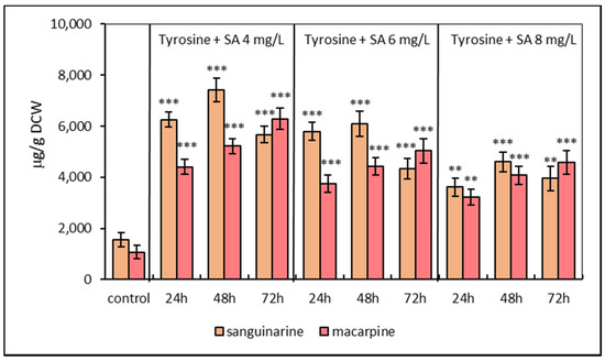 Production of sanguinarine and macarpine in simultaneously elicited suspension cultures of E. californica with salicylic acid (SA) and L-tyrosine (1 mM) in a time and dose-dependent manner. Values represent means ± SD from triplicate samples of three parallel experiments. The chart displays statistically significant differences (** p ≤ 0.01, *** p ≤ 0.001) of sanguinarine and macarpine content between non-elicited (control) and elicited samples.