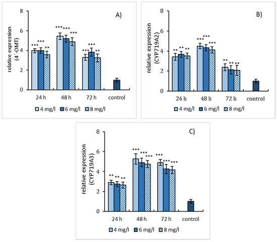 Salicylic acid-induced expressions of 4′-OMT (A), CYP719A2 (B), and CYP719A3 (C) genes in E. californica suspension cultures. The relative expression level shows values standardized by that of the non-elicited sample (control) as 1. Values are means ± SD from triplicate samples of three parallel experiments. Charts display statistically significant differences (** p ≤ 0.01, *** p ≤ 0.001) of gene expressions between non-elicited (control) and elicited samples.