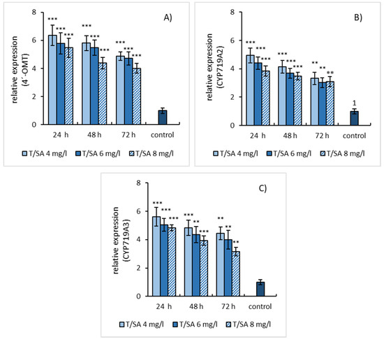 Expression patterns of 4′-OMT (A), CYP719A2 (B), and CYP719A3 (C) genes in E. californica suspension cultures affected by the combination of SA and L-tyrosine (1 mmol/L). The relative expression level shows values standardized by that of the non-elicited (control) sample as 1. Values are means ± SD from triplicate samples of three parallel experiments. Charts display statistically significant differences (** p ≤ 0.01, *** p ≤ 0.001) of gene expressions between non-elicited (control) and elicited samples.