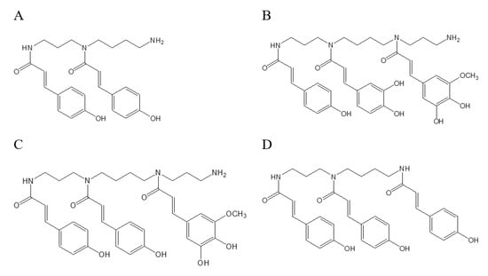 Phenolamines in the 50% fraction of rape bee pollen. (A) di-p-coumaroyl spermidine, (B) p-coumaroyl caffeoyl hydroxyferuloyl spermine, (C) di-p-coumaroyl hydroxyferuloyl spermine, (D) tri-p-coumaroyl spermidine.