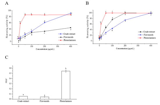 Antioxidant activity of crude extract, flavonoids and phenolamines from rape bee pollen determined by three kinds of assays. (A) DPPH assay, (B) ABTS assay, and (C) Ferric reducing antioxidant power (FRAP) assay.