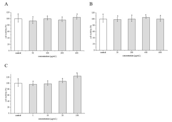 Cytotoxic effect of crude extract (A), flavonoids (B) and phenolamines (C) from rape bee pollen on HepG2 cells. Data are represented as mean ± SD (n = 6). Different letters marked above the bars indicate significant differences between groups (p < 0.05).
