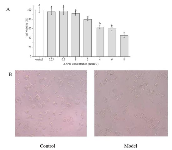 (A) Effect of AAPH on HepG2 cell viability. (B) Changes in cell morphology after the treatment of 2 mM AAPH for 24 h (model group) compared with the control group. Data are represented as mean ± SD (n = 6). Different letters marked above the bars indicate significant differences between groups (p < 0.05).
