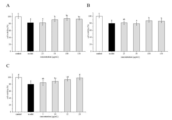 Protective effects of crude extract (A), flavonoids (B) and phenolamines (C) from rape bee pollen against AAPH-induced damage. Data are represented as mean ± SD (n = 6). Different letters marked above the bars indicate significant differences between groups (p < 0.05).