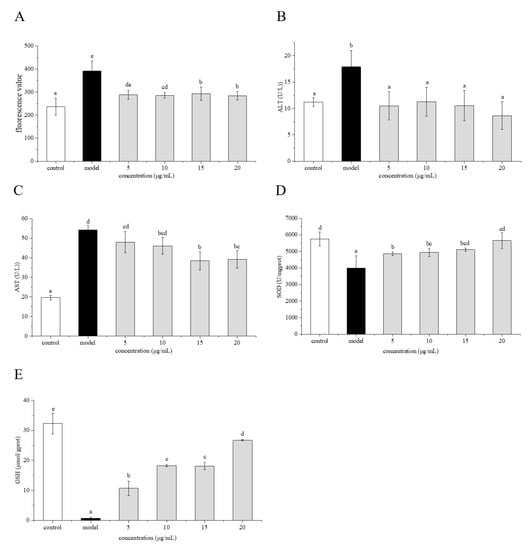Effect of phenolamines from rape bee pollen on reactive oxygen species (ROS) (A), alanine aminotransferase (ALT) (B), aspartate aminotransferase (AST) (C), superoxide dismutase (SOD) (D), glutathione (GSH) (E) in HepG2 cells injured by AAPH. Data are represented as mean ± SD (n = 6). Different letters marked above the bars indicate significant differences between groups (p < 0.05).