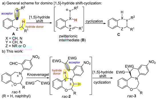 In this work, the substrate (rac-2) able to undergo a [1,5]-hydride shift was obtained as a Knoevenagel intermediate in the reaction of N-aryl-1,4-benzoxazepine derivatives rac-1 with active methylene reagents. The 5-H benzylic hydrogen of rac-2, adjacent to a tertiary amine nitrogen atom, acted as a hydride donor and a zwitterionic intermediate, formed in a [1,5]-hydride shift, cyclized affording the condensed tetracyclic 1,4-benzoxazepines rac-3 with complete regio- and diastereoselectivity.