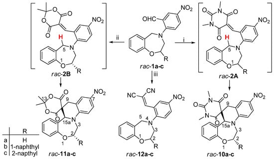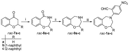In the first step, a regioselective Schmidt reaction of rac-7a–c was carried out with NaN3 affording the corresponding 3,4-dihydro-1,4-benzoxazepine-5(2H)-ones rac-8a–c (Scheme 3), which were reduced with LiAlH4 under reflux to provide 2,3,4,5-tetrahidro-1,4-benzoxepines (rac-9a–c). In the final step, the N-arylation of rac-9a was performed with 2-fluoro-5-nitrobenzaldehyde to result in rac-1a in 95% yield. For the N-arylation of rac-9b and rac-9c, the more economical but less reactive 2-chloro-5-nitrobenzaldehyde could be used instead. Furthermore, rac-1a–c were reacted with 1,3-dimetylbarbituric and Meldrum’s acids, which initiated a Knoevenagel-[1,5]-hydride shift-cyclization domino reaction (Scheme 4). The 1- and 2-naphthyl groups are known to adopt different orientations relatively to the condensed heterocyclic skeleton and they also exhibit different rotational energy barriers for their rotations, which may result in different bioactivities as demonstrated recently for our synthetic pterocarpans having antiproliferative activity [32].