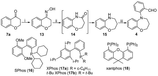 The reaction condition of the Knoevenagel-[1,5]-hydride shift-cyclization cascade was also tested on the analogous 1,5-benzoxazepine derivative 4, in which only a less activated C-4 methylene group is available for the hydride shift. The N-aryl-1,5-benzoxazepine analogue 4, starting material of the domino reaction, was synthesized in four steps from chromanone (Scheme 5). The classical Beckmann rearrangement of the (E)-ketoxime (13) afforded the 2,3-dihydro-1,5-benzoxazepin-4(5H)-one (14) [42], which without isolation, could be readily reduced to 15 with DIBAL-H [43]. N-arylation of 15 with 2-fluoro-4-nitrobenzaldehyde could not be achieved in an SNAr reaction with potassium or cesium carbonate in dry DMF at 140 °C due to the reduced nucleophilicity of the arylamine nitrogen. Thus, Buchwald-Hartwig N-arylation of 15 was carried out with 2-bromobenzaldehyde, Pd(OAc)2, a sterically hindered phosphine ligand and tetra-n-butylammonium bromide (TBAB) [44]. The reaction was optimized by testing different phosphine ligands [SPhos (16), XPhos (17a), t-butyl XPhos (17b), xantphos (18)] anhydrous solvents (1,4-dioxane, THF, toluene) and bases (Cs2CO3, K2CO3, KOtBu) and the best condition [2-bromo-benzaldehyde, Pd(OAc)2 (7.5 mol%), SPhos (16, 10 mol%), Cs2CO3, TBAB, anhydrous 1,4-dioxane, reflux] afforded the N-aryl derivative 4 with 87% yield.
