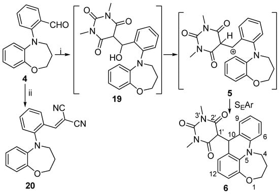 The N-aryl derivative 4 was reacted with 1,3-dimethylbarbituric acid and instead of the expected domino Knoevenagel-[1,5]-hydride shift-cyclization sequence, the 19 precursor of the Knoevenagel product formed a stabilized benzylic carbocation (5), which initiated an SEAr reaction with the activated benzene ring affording the condensed acridane derivative 6 with 64% isolated yield (Scheme 6). According to the NMR data, all the methylene protons of the oxazepine moiety remained intact, while an aromatic C-H group was changed to a quaternary carbon. Two methine carbons appeared in the DEPT 13C NMR spectrum at 49.5 and 59.0 ppm corresponding to C-10 and C-1′, respectively, the protons of wich had a 4.4 Hz 3J10-H,1′-H coupling constant. The condensed 2,3-dihydro-1H,8H-[1,4]oxazepino[2,3,4-de]acridine moiety has not been reported yet and direct conversion of 2-(N-arylamino)benzaldehyde derivatives to acridanes under mild conditions represents a new synthetic potential. The reaction of 4 with malonitrile stopped at the stage of the Knoevenagel product 20, which could not be converted to a cyclized product even under stronger reaction condition (higher temperature, microwave activation). The reaction with Meldrum’s acid produced a complex reaction mixture, which has not been analyzed further.