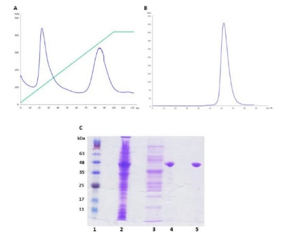 Fluorescent BEL β-trefoil purification. (A) Elution profile of fluorescent BEL β-trefoil on the IMAC column. The blue line refers to the protein elution followed spectrophotometrically at 280 nm; the green line represents the increase in the imidazole concentration along the gradient. (B) Elution profile of fluorescent BEL β-trefoil on the G75 gel filtration column, recorded at 280 nm. (C) SDS-PAGE (12%). Lane 1: molecular mass markers (BlueRay Prestained Protein Marker, Jena Bioscience); lane 2: crude extract from bacteria; lane 3: first peak from the IMAC column, corresponding to nonspecific proteins; lane 4: second peak from the IMAC column, corresponding to the fluorescent BEL β-trefoil; lane 5: pure fluorescent BEL β-trefoil present in the main peak of the G75 chromatography.