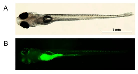 BEL β-trefoil injected in the yolk of zebrafish (N:15) was able to diffuse in tissues. After 5 days of injection (dpi) BEL β-trefoil was still present in zebrafish. (A) Phase-contrast photograph of zebrafish (A). (B) Fluorescence image showing the GFP-BEL β-trefoil in zebrafish. Magnification 20X.