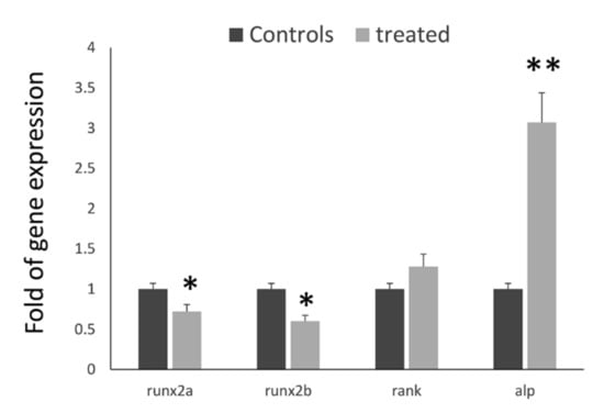 In order to analyze a possible effect of BEL β-trefoil on the expression of endogenous runx2, we treated zebrafish with or without 0.25 µM lectin. At the experimental endpoint (9 dpf), total RNA was collected and the expression of both runx2a and runxb genes was analyzed. Our analyses showed that lectin treatment affected the expression of endogenous runx2, and both runx2a and runx2b genes were downregulated (Figure 6). Consequently, we analyzed additional genes involved in bone remodeling. In particular, we analyzed the expression of receptor activator of necrosis factor κ-β (rank) gene and of alkaline phosphatase (alp) gene. Our results showed a statistically significant upregulation of alp in lectin-treated zebrafish. We also observed an increased, although not statistically significant, expression of rank.