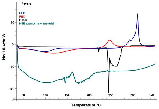 Differential scanning calorimetry (DSC) of raw materials: HEC, blue line; PEC, red line; P, black line; HSE extract raw material, green line.
