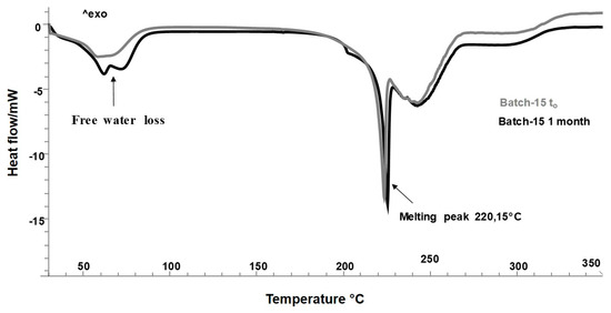 Differential scanning calorimetry (DSC) thermograms of Batch-15 (48 h in a desiccator) at t0, and after 1 month.