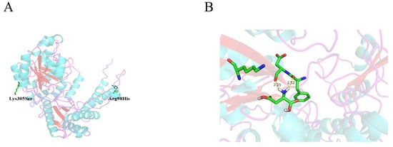 The kinetic parameters of TcPanD and TcPanD-R98H/K305S were determined while using L-aspartate as the substrate. Table 2 shows the kinetic parameters of TcPanD and TcPanD-R98H/K305S. The Km value of TcPanD-R98H/K305S was 1.23 mM, the Vmax of the reaction was 7.05 U·mg−1, the Kcat value was 7.64 s−1, and the Kcat/Km value was 6.21 s−1·mM−1. The Km value of TcPanD was 1.35 mM, the Vmax of the reaction was 2.88 U·mg−1, the Km and Kcat/Km values of TcPanD were 3.12 s−1 and 2.31 s−1·mM−1, respectively. The mutant had lower Km values than the wild TcPanD, which suggested that the mutant TcPanD-R98H/K305S had higher substrate affinity than that of TcPanD. The high Vmax and Kcat value of TcPanD-R98H/K305S showed its higher catalytic activity than the wild type of TcPanD.