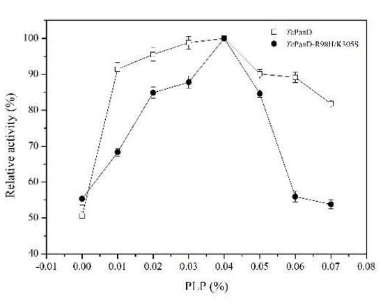 PLP acts as a cofactor and plays an important role for the catalysis of TcPanD, as the TcPanD belongs to a pyridoxal 5’-phosphate (PLP)-dependent decarboxylase. The results from Figure 3 showed that, with the increase in PLP, the enzymatic activities of the two proteins reached the highest levels under the treatment of 0.04% PLP. In addition, the mutant TcPanD-R98H/K305S was shown to be more sensitive to PLP than the wild TcPanD. Thus, the PLP is a potential regulator in β-alanine production.