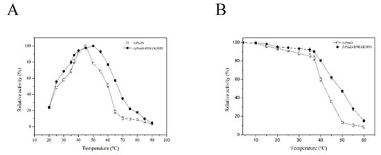 Temperature is an important factor affecting the rate of an enzymatic reaction. The optimum temperature of TcPanD was 45 °C, while that of TcPanD-R98H/K305S was 50 °C, as shown in Figure 4A. Moreover, the TcPanD activity remained more than 90% at a range of 40–45 °C and it was lost rapidly at above 45 °C. The TcPanD-R98H/K305S activity remained more than 90% of the highest activity at a range of 40–55 °C. The residual enzyme activity of the wild TcPanD was relatively stable at a temperature range of 4–37 °C, as shown in Figure 4B. When the temperature reached the optimal level (45 °C), the activity of the wild TcPanD only remained 35.73%. Meanwhile, the mutant TcPanD-R98H/K305S was relatively stable at a temperature range of 4–60 °C. When the temperature reached up to 50 °C, the residual activity of the TcPanD-R98H/K305S remained 47.38%. Thus, the mutant TcPanD-R98H/K305S showed better thermostability than the wild TcPanD. Although the optimal temperatures of TcPanD and TcPanD-R98H/K305S were 45 °C and 50 °C, respectively, the enzyme could remain stable at 37 °C. Thus, the optimal temperature for the enzyme is 37 °C, at which it had the highest activity and thermostability.