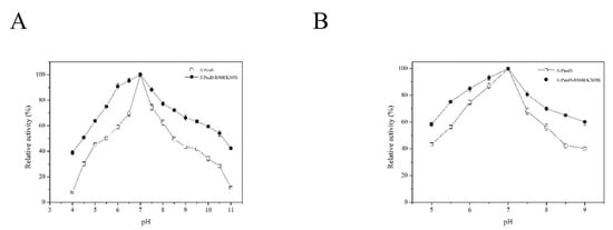 The effects of different pH (4.0–11.0) on the purified TcPanD were investigated to obtain the optimal pH for enzyme activity. The purified protein was incubated at different pH for 0 h and 2 h, and the residual activity for each condition was measured, respectively, to investigate the pH stability. The highest enzyme activity was set to 100%.