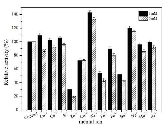 The metal ion is one of the important factors affecting the activity of the enzyme. In this study, the effects of metal ions on the wild TcPanD and the mutant TcPanD-R98H/K305S activity at two different concentrations (1 and 5 mM) were investigated. Under the low metal ion concentration (1 mM), Na+, Ni2+, Co2+, K+, and Ca2+ have an activating effect on TcPanD-R98H/K305S, while Fe2+, Cu2+, Zn2+, and Ba2+ have an obvious inhibiting effect, as shown in Figure 6. A high concentration of Ni2+ and Na+ (5 mM) has an obvious activating effect, while Zn2+, Cu2+, Ba2+, and Fe2+ have an inhibiting effect.