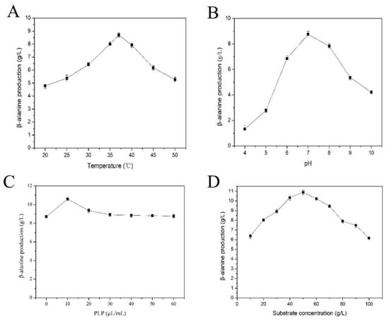 Optimization of the whole-cell biocatalysis conditions. (A), The effect of reaction temperature on β-alanine production; (B), The effect of reaction pH on β-alanine production; (C), The effect of PLP addition on β-alanine production; and, (D), The effect of substrate concentration on β-alanine production.