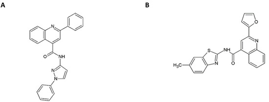 2-(2-furanyl)-N-(6-methyl-2-benzothiazolyl)-4-Quinolinecarboxamide (T0505-6180/CSFCI) and 2-phenyl-N-(1-phenyl-1H-pyrazol-3-yl)-4-Quinolinecarboxamide (TO502-2403/CSFCII) were purchased from Ambinter (Orléans, FRANCE). The structural formula of both compounds is depicted in Figure 1. Details on the synthesis of the quinolinecarboxamide analogues can be obtained from Gerhard Puerstinger (University of Innsbruck, Innsbruck, Austria). Structural information for each analogue synthesized can be found in Supplementary Table S1. The synthesis of LZ37 [7-[3-(1,3-benzodioxol-5-yl)propyl]-2-(2-furyl)-7H-pyrazolo[4,3-e][1,2,4]triazolo[1,5-c]pyrimidin-5-amine] [22], BPIP (5-[(4-bromophenyl)methyl]-2-phenyl-5H-imidazo[4,5-c]pyridine [20], and ethyl 2-methylimidazo[1,2-a]pyrrolo[2,3-c]pyridin-8-carboxylate (AG110) [21], were reported earlier. 3′-deoxyguanosine-5’-triphosphate (3’-dGTP) and 2’-C-methylguanosine-5’-triphosphate (2′-C-me-GTP) were purchased from Trilink (San Diego, CA).