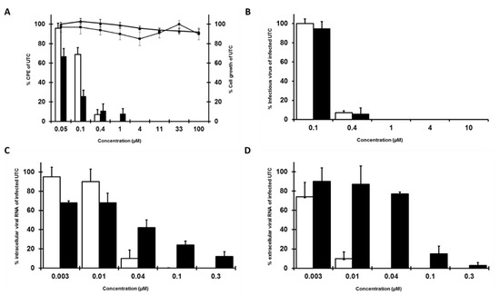 Effect of TO502-2403 (CSFCII, open bars, diamonds) or TO505-6180 (CSFCI, black bars, squares) on (A) BVDV (NADL)-induced cytopathic effect (CPE) formation in the MDBK cells (bars) and on the proliferation of exponentially growing Madin–Darby (MDBK) cells TO502-2403 (CSFCII, diamonds) or TO505-6180 (CSFCI, squares), (B) on infectious virus yield, (C) on intracellular viral RNA, and (D) on the release of extracellular viral RNA.