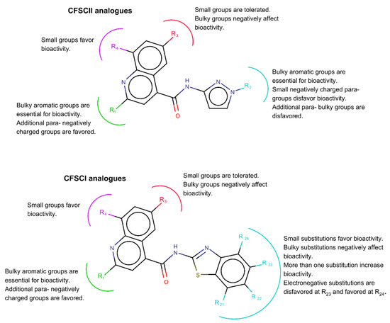 In addition to the previously discussed influence of substitutions at R1, R3, and R4, for the CSFCI derivatives, small non-bulky substitutions at any position—R21, R22, R23 and R24—contributed to improved bioactivity. In contrast, bulky substitutions at the later positions highly decreased bioactivity. This effect could be observed from the comparison of compounds 51, 57, 59 and 112. According to the steric MIF surrounding positions R21, R22, R23, and R24, the simultaneous substitution of these positions in the same compound could increase bioactivity. Additionally, electronegative substitutions were favored at position R24 and disfavored at R23. Finally, the presence of the pyrazol moiety in the CSFCII derivatives and of the benzothiazole group in the CSFCI analogues attached to the quinoline-4-carboxamide scaffold were essential for bioactivity.