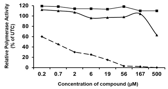 Even if this mutation provided strong evidence that the viral polymerase was the target of interaction with the class of quinolinecarboxamides, similar to the reference compound BPIP [20], AG110 [21], and LZ37 [22], none of these compounds had any inhibitory effect on the highly purified BVDV RdRp.