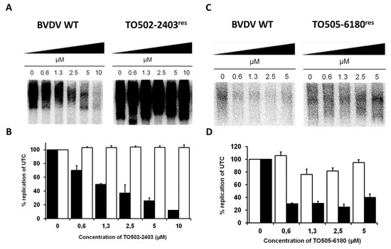Since TO502-2403/CSFCII and TO505-6180/CSFCI did not inhibit the activity of the purified BVDV RdRp, we tested the effect of the compound on viral RCs isolated from MDBK cells that had been infected with the wild-type virus or with the selected TO502-2403res or TO505-6180res virus BVDV strain. TO502-2403/CSFCII inhibited the activity of the BVDV WT replication complexes in a dose-dependent manner, with a maximum inhibition ~90% at 10 µM (Figure 5A,B). In contrast, the activity of RCs isolated from MDBK cells that had been infected with the TO502-2403res strain were not susceptible to the inhibitory effect of TO502-2403/CSFCII (Figure 5A,B). TO505-6180 inhibited the activity of the BVDV wt RCs in a dose-dependent manner (Figure 5C,D), whereas RCs isolated from MDBK cells that had been infected with the TO505-6180res virus was 3 to 4-fold less susceptible to the inhibitory effect of TO505-6180, as compared to BVDV wt RCs (Figure 5C,D).