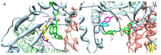 Docking of TO502-2403/CSFCII in this cavity revealed the following possible interactions between the polymerase and the compound: (i) a hydrogen bond between the N in the middle of the scaffold of TO502-2403/CSFCII and the residue A392 via the main chain O and (ii) a stacking interaction between the aromatic ring of the F224 and the aromatic ring of the quinoline-4-carboxylic acid scaffold (Figure 6). When the phenylalanine mutated into a proline the stacking interaction would be lost, thereby, also destabilizing the hydrogen bond with A392. Hence, when the F224P substitution occurred, the interaction between the TO502-2403/CSFCII inhibitor and the RdRp would no longer be possible
