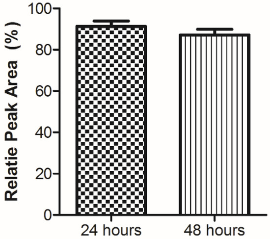 The peptides that were prepared included the pentapeptide previously reported by Kobinger’s group [20,21,22], as well as several extended analogs that contain this 5 aa sequence (Table 1). Peptides 2 and 3 are dodecapeptides that have additional lysine and glutamic acid residues, respectively, to increase branching points, as well as phenylalanine residues to promote pi–pi intermolecular interactions, all of which provide additional sites for nicotine conjugation and could aid in nanoparticle self-assembly [36]. Peptide 4 contains a succinamic acid residue at the N-terminal for the potential binding to nicotine. All of the peptides were synthesized using our standard solid-phase synthesis protocol with some modifications [5] and were obtained in moderate-to-good yield with high purity (Table 2). The plasma stability of pentapeptide 1 was assessed using RP-HPLC and our previously published methods [37], with results confirming that the peptide sequence was not recognized and cleaved by proteolytic enzymes (Figure 1), and would likely improve the overall stability of the conjugate vaccine in vivo.