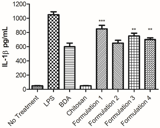 It appears that the in vitro assessment of IL-1β is a useful tool to screen these adjuvant formulations for potential in vivo performance as it can enhance antigen presentation and humoral immune responses [40,41,42,43,44]. This is reflected in the data as the BDA group alone was not as effective as an adjuvant of the nicotine vaccine as compared to Formulation 1 and vaccine Group 5 for in vitro and in vivo testing, respectively.