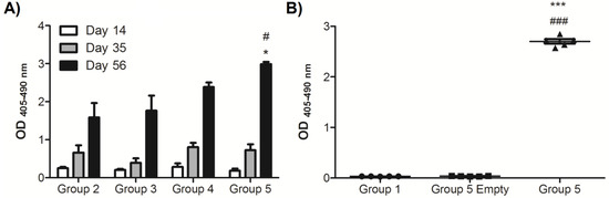 Levels of anti-nicotine IgG. Female BALB/c mice were administered intranasal installations of either PBS (Group 1) or different nicotine vaccine formulations: [BDA/Nic Hapten] (Group 2), [BDA/Nic Hapten /Chitosan] (Group 3), [BDA/Peptide 1/Nic Hapten] (Group 4), and [BDA/Peptide 1/Nic Hapten/Chitosan] (Group 5); Group 5 Empty refers to the delivery system without nicotine. Blood was collected two weeks post-vaccination (Day 14, 35, 56, and 77). (A) Anti-nicotine IgG from individual sera and diluted 1:300. Data are represented as ± SEM (n = 4–5 for each group). Statistical significance was determined by a Kruskal–Wallis with a Dunn’s multiple comparison test * p < 0.05 as compared to Group 2 and # p < 0.05 as compared to Group 3. (B) In a repeated trial, the total anti-nicotine IgG present was detected in sera (1:600 dilution). Each point represents an individual mouse and data are represented as ± SEM, n = 5. Statistical significance was determined by an ANOVA with a Tukey HSD. *** p ≤ 0.001 as compared to Group 1 and ### p ≤ 0.001 as compared to Group 5 Empty.