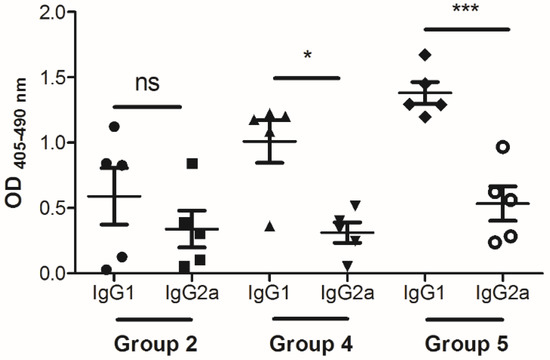 Levels of anti-nicotine IgG isotypes. Female BALB/c mice were administered intranasal instillations of different nicotine vaccine formulations and blood was collected two weeks post-vaccination. Individual mouse sera were diluted and anti-nicotine IgG1 and IgG2a were assessed on day 77. Data are represented as ± SEM, n = 5. Statistical significance was determined for Group 5 by an unpaired 2-tailed T-test, *** p = 0.0006, and for Group 4 by a Mann–Whitney test, * p = 0.0317.
