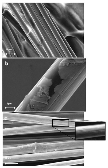 Initially, the CFs were desized in acetone [24] and then oxidized using an acidic treatment under ultrasonication. After this procedure, a plethora of active oxygen groups, mainly hydroxylates and carboxylates, appeared on the surface of the CFs, increasing the total surface energy and polarity, which was helpful to improve the wettability of the CFs [25,26]. The morphology of the CFs was studied using scanning electron microscopy (SEM), and characteristic micrographs are given in Figure 1.