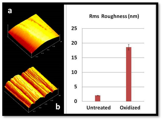 Atomic force microscopy (AFM) topography images of (a) untreated and (b) oxidized CFs.
