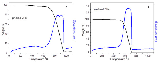 Thermogravimetric and differential thermal analysis (TG-DTA) curves of pristine CFs and oxidized CFs are depicted in Figure 3. Pristine CFs were stable until 700 °C in the air, while, after desizing and acid treatment, oxidized CFs were decomposed much easier between 500 and 700 °C (see Figure 3). The decomposition of both the pristine and oxidized CFs was accompanied by an analogous exothermic peak, recorded in DTA as expected. Pristine CFs also indicated a 2% weight loss between 350 and 500 °C, which could be attributed to the removal of the sizing agent.