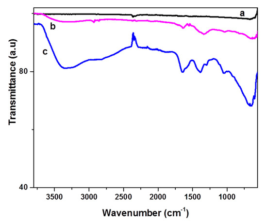 The Fourier–transform infrared spectrometer (FT-IR) spectrum of the oxidized CFs (see line b in Figure 4) showed a few weak but characteristic peaks due to the presence of oxygen groups on their surface, in contrast with the featureless spectrum of pristine CFs (see line a in Figure 4). The peaks at 3300 (OH stretching vibrations) and 1033 cm−1 (C-O stretching vibrations) indicated the appearance of hydroxyl groups on the CF surface. The peaks at 1715 and 1640 cm−1 (C=O stretching) could be attributed to the presence of carboxylates and carbonyl groups, respectively, while peaks at 2860, 2930, and 1335 cm−1 indicate sp3 C-H stretching [27,28,29].